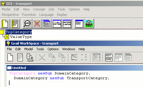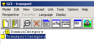 The operation newSub allows the creation of an elementary concept; it is given an identifier, and specifies at the same time where it appears in the concept structure hierarchy. After it has been defined in this way, it can be accessed by its identifier. We've created two new categories in this way - DomainCategory and TransportCategory. TransportCategory will be our starting point for the example. DomainCategory is a standard GRAIL convention which simply used for organisation. By convention, the highest proper category in any GRAIL model is DomainCategory.