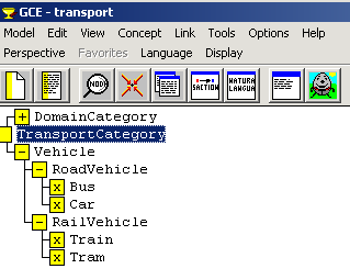 Now select the new statements, click the right mouse button, and select Compile. Go back to GCE and find TransportCategory, click on Vehicle in the browser to see what it subsumes. Click on and expand each of the subsumed categories in turn (as a short cut, press * on your keyboard). You should see a browser as shown in below.