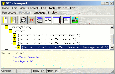 The criteria which form the definition of the concept are also known as its defining criteria. The top line of the Definition pane shows the elementary category from which the category is formed (the base), whilst the remaining entries show each of its defining criteria.