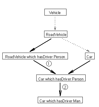 Formal subsumption for composite concepts is essentially a recursive notion using subsumptions of the constituent categories. In the following diagram, illustrating a more complex area of the hierarchy, Subsumption 1 illustrates a subsumption where the base categories (RoadVehicle and Car) are related, while 2 illustrates the situation where the categories in the criteria (Person and Man) are related. The dotted arrows indicate asserted subsumptions, whereas the solid arrows indicate formal subsumption relationships that have been derived by the GRAIL engine.